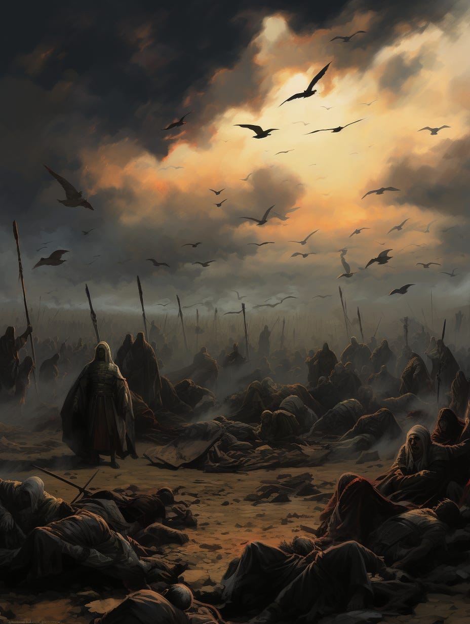 The air was thick with smoke and the stench of the dead, the sky hazy from the pyres. Orzariu soldiers walked among the corpses, pausing for a moment to put wounded men out of their misery. Cr…